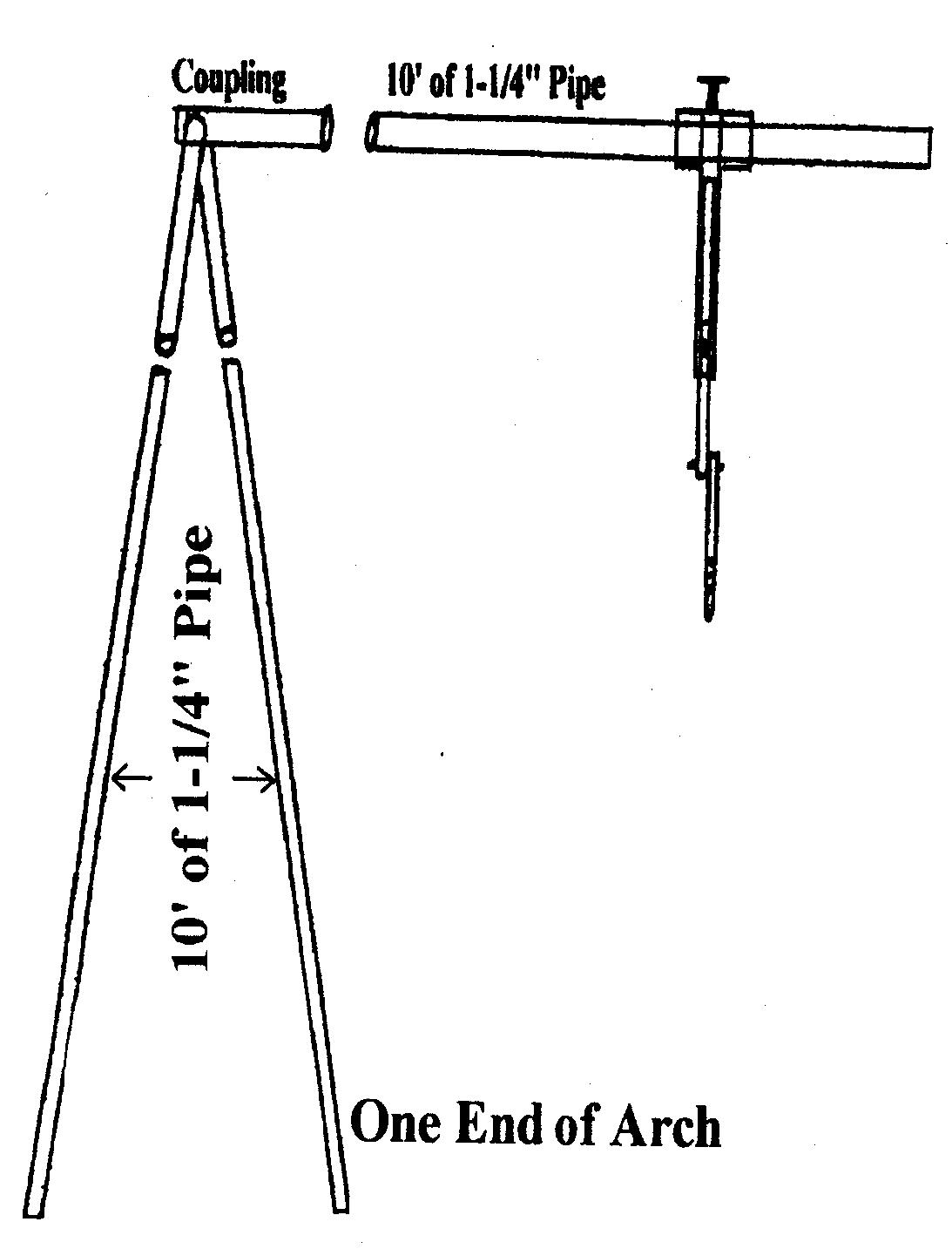 We prefer the portable type of arches for several reasons. First, they may be moved from one site to another with very little trouble so that if a track becomes too deep a new one may be started. They may also be transported to other locations when holding a joust or exhibition. Our arches are made with five ten-foot long electrical conduit or aluminum tubing, one and a quarter inches