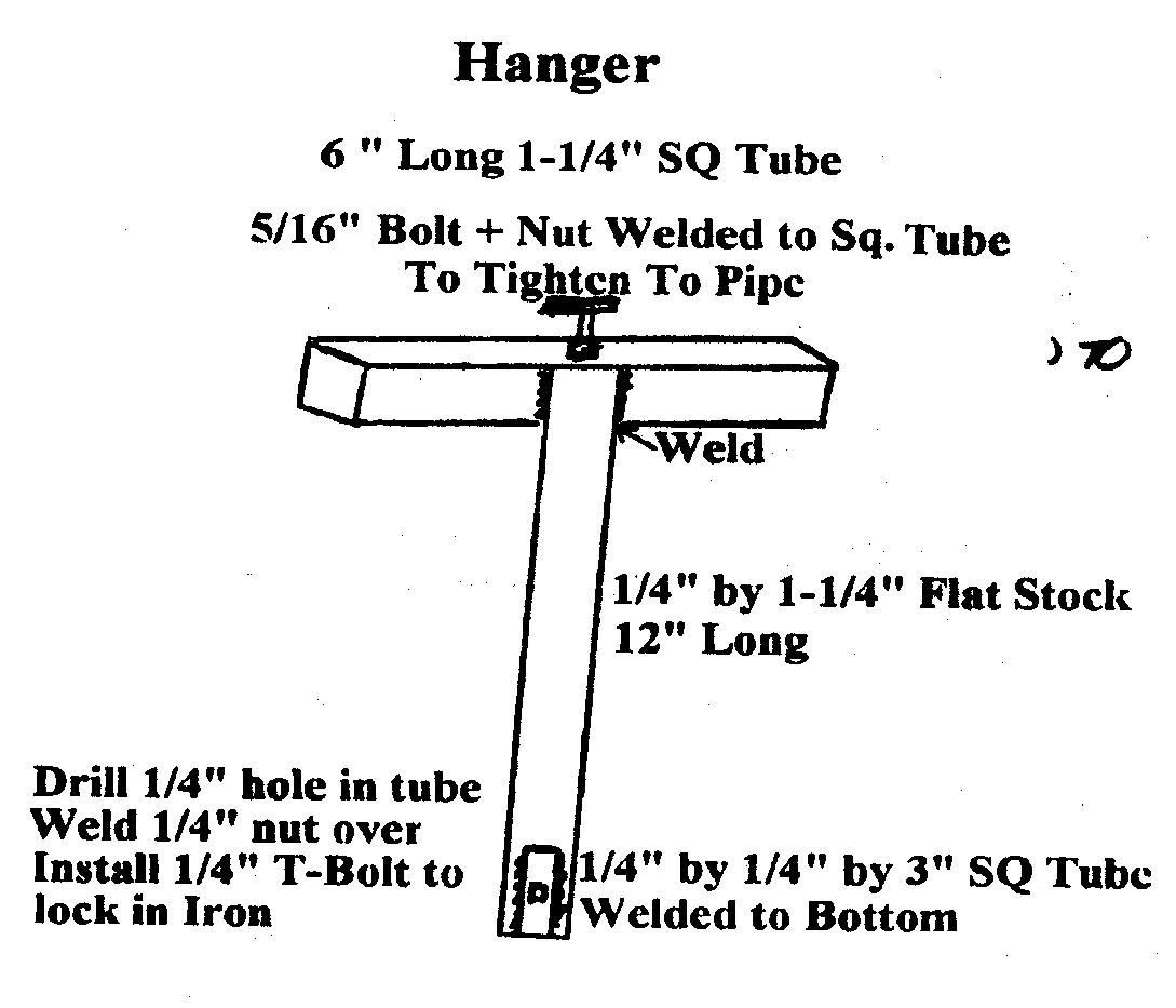 There are three hangers needed, one for each arch. The hangers are made from one and one quarter inch (11/4") inside diameter square tube or pipe six inches (6") long. Weld a piece one foot (1') long of one and one quarter inch (11/4") by one quarter inch (1/4") flat stock in center of tube. On top of the tube drill a five sixteen inch (5/16") hole in the center then weld a five sixteen inch (5/16") nut over the hole and add a bolt. This is to tighten the hanger to the arch. At the end and in the center of the one foot (1') piece weld a three inch (3") long piece of one quarter inch (1/4") square stock. In the center of the square stock drill a one quarter inch (1/4") hole and weld a one quarter inch (1/4") nut over the hole and add a bolt. This is to tighten the iron in the hanger. (See Illustration)