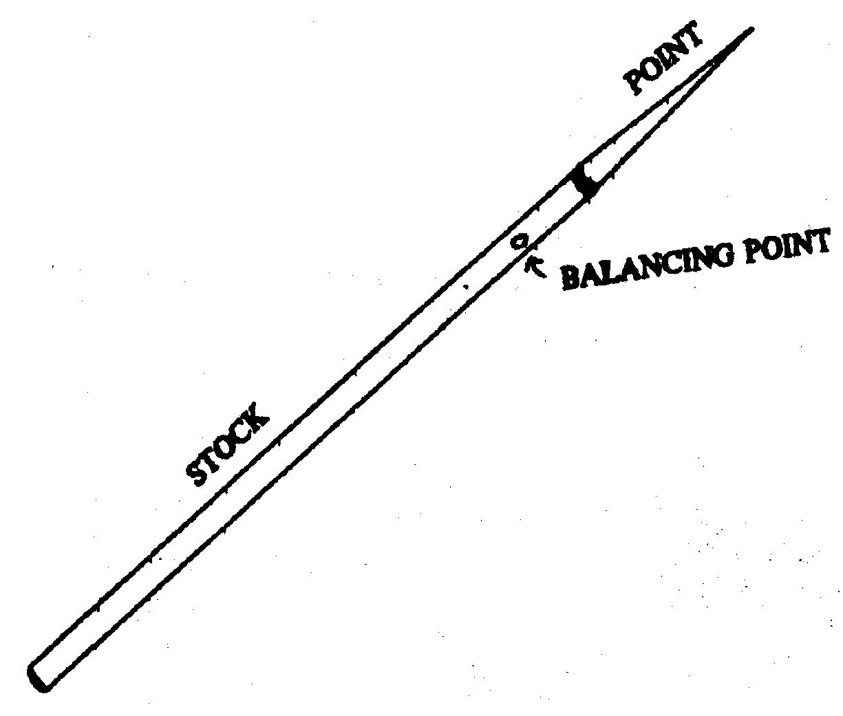 The stock us usually made of wood, and its length depends largely on how long and how heavy the point is. The main concern in making you lance should be your balancing point. The lance is held at the balance point (see illustration).