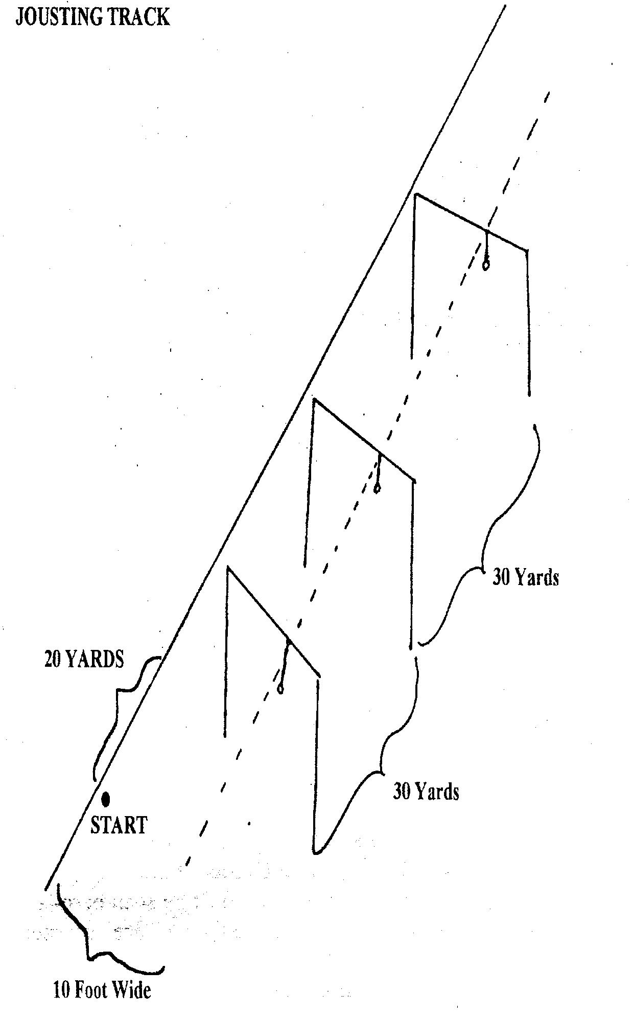 If adequate space is not available for a jousting track of this size, subtract yardage from the beginning or the end. The 30 yards between each arch must remain the same for the purpose of timing.