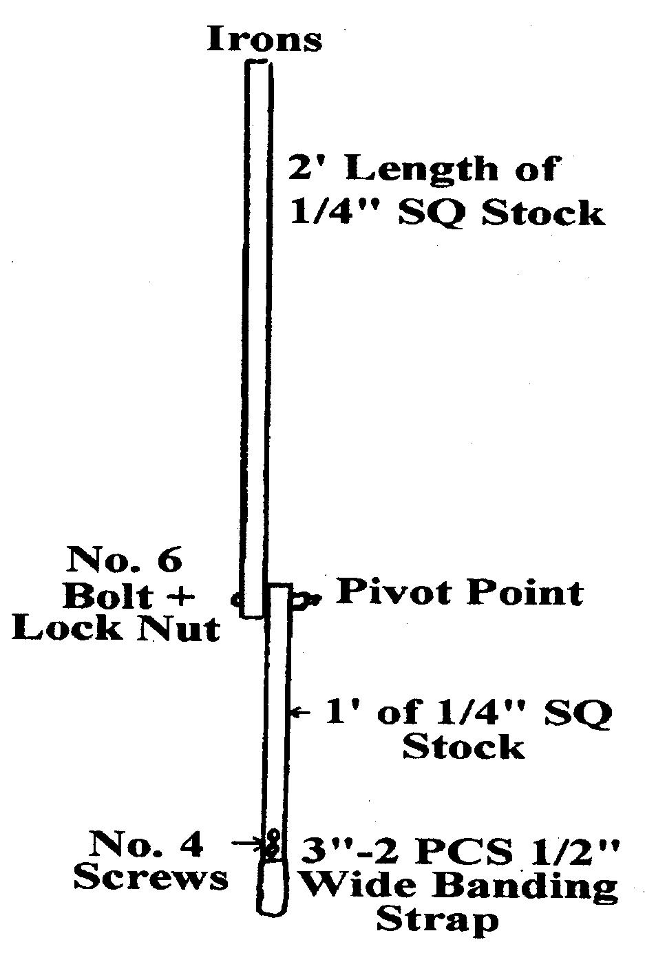 There are three irons needed, one for each arch. The irons are made of one quarter inch (1/4) square stock. For each iron you will need one two foot (2') piece and one, one foot (1) piece. Bolt them together one inch (1") from the ends to create a pivot. At the end of the one foot (1') piece cut a two inch (2") deep slot for the pinchers (made from two pieces of half inch (1/2") wide banding strap) to slide into and be bolted in. (See illustration).