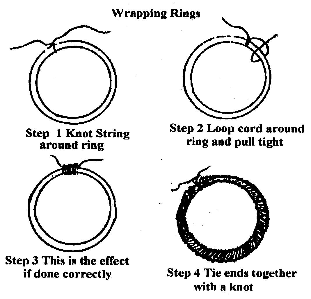 A complete set of jousting rings consists of 28 rings. Seven different sizes ranging from one quarter inch in diameter to one and three-quarter inches in diameter. These are made of metal and may be bought in some rural hardware stores or harness shops. They are called harness rings. If unable to purchase these they may be made from heavy wire formed into a circle and welded where it meets. Rings are wrapped with no. 21 white cotton cord as shown in the illustration. They are kept white by dipping them in white shoe polish and hanging on a string to dry.